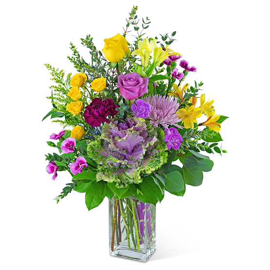 Come to your local flower shop for the freshest and most gorgeous bouquets of flowers. Skylark Song is one of our staff favorites because it features long-lasting roses, carnations, Dianthus, Lilies, Mums, Kale, Alstroemeria, and other premium foliage. This cheery arrangement will add happiness to any special occasion. Frontdoor flower delivery is our specialty!