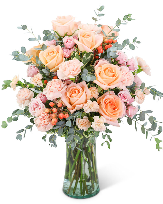 Sorbet Rose Garden may look good enough to eat but it’s even more beautiful to receive and display! This floral design is a soft collection of roses, carnations, hypericum berries, and assorted foliage in a tall clear vase. As irresistible as its namesake, it’s the perfect gift for an anniversary, birthday, or any special occasion. We offer same-day flower delivery in most cases.