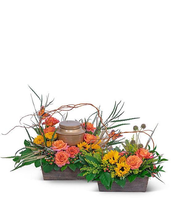 The Sunset Reflections Tribute is a beautiful way to reflect on your loved one's life. Sunflowers represent pure love and adoration, which makes these family flowers the perfect accent to a funeral or celebration of life ceremony. This memorial design features orange roses, bright sunflowers, hypericum berry, and curly willow, all artfully surrounding the urn. This tribute is perfect for cremation services or a Celebration of Life Service to honor your loved one.